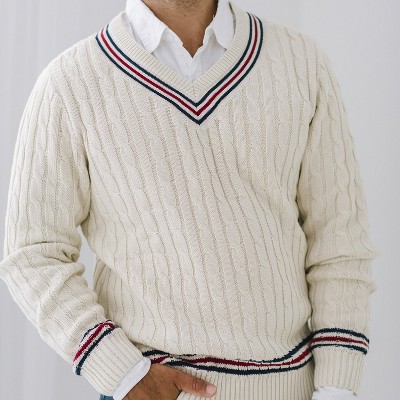 Mens V Neck Sweater Cable Twisted Knitted Long Sleeve Pullover Cricket Sweaters. Get a Sale Alert. Beautiful cable knit adorns the entire sweater and is trimmed in stripes at the neck.